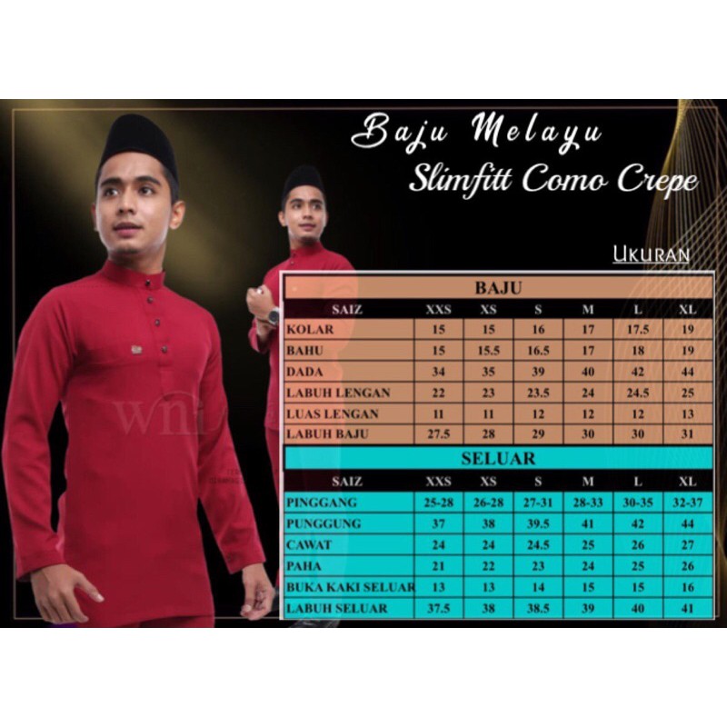 Ukuran baju melayu slim fit **material sakura@pearl skin **design moden **5 saiz (dewasa) s m l xl xxl **11 saiz (kanak2) 18 20 22 24 26 28 30 32 34. Baju melayu slimfit keistimewaan baju melayu slimfit ✔️ material como crepe.
